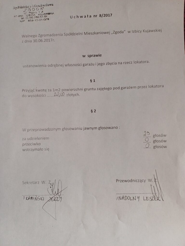 Uchwała 8/2017r. dotycząca ustanowienia własności garażów